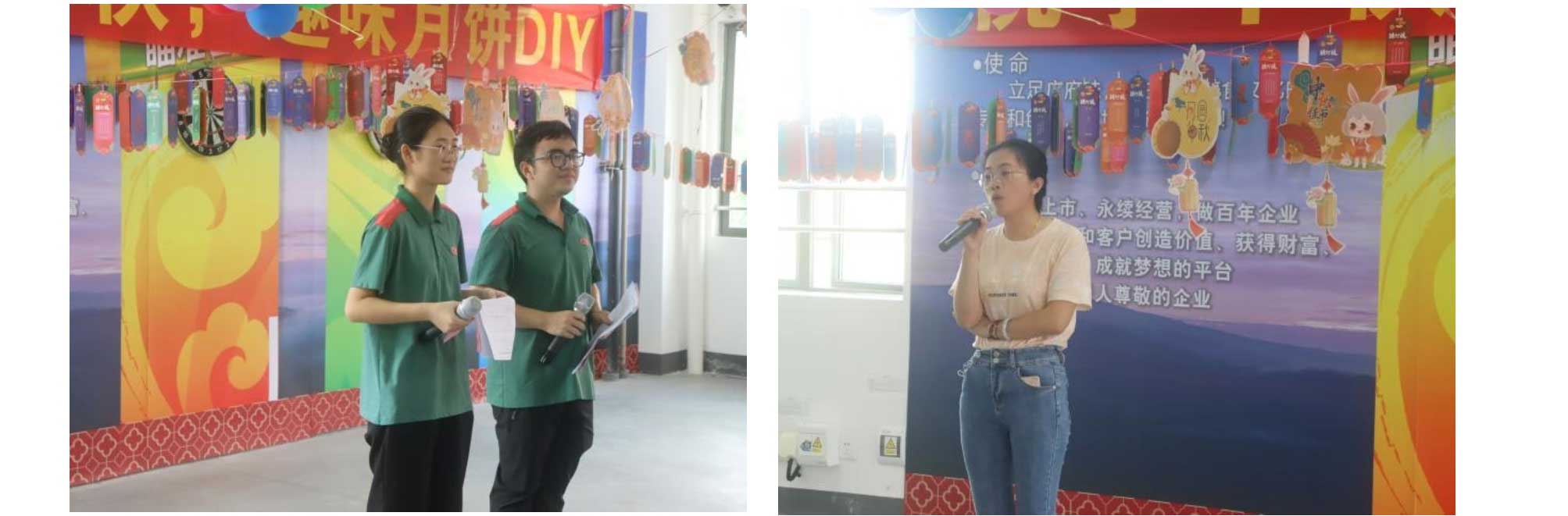 15:30分,喜悅的音樂如約響起,中秋游園活動正式開始,在主持人漆旺、陳玉瓊的介紹下,五支參賽隊喊出自己的口號,為自己的團隊們吶喊助威。在活動開始前由葉建國、李文宇、漆旺組團的快樂合唱團《但愿人長久》獻上節(jié)日祝福。隨后行政部施華經(jīng)理對本次活動做開場致辭,提前祝福大家中秋節(jié)快樂,施經(jīng)理強調(diào)這是我們第一次DIY月餅,希望大家把今天自己新手制作的月餅帶回去給家人一同分享,讓他們感受到不一樣的關懷,不一樣的溫暖,不一樣的愛。