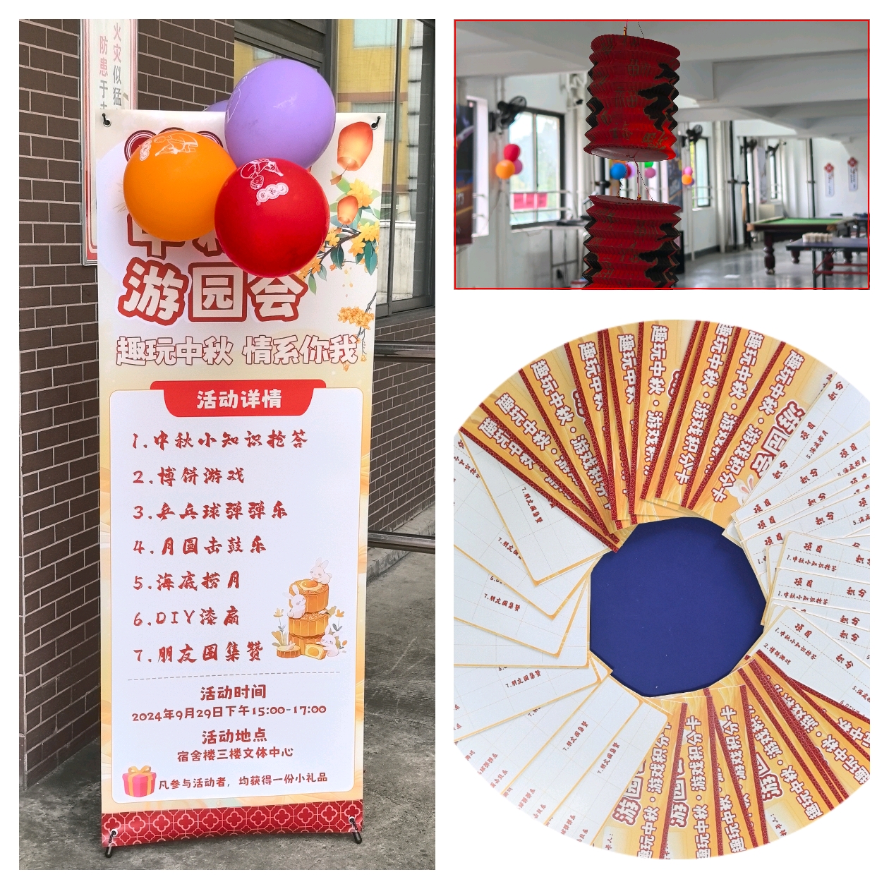 活動當天12:00,在各部門的大力支持及協(xié)助下,現(xiàn)場懸掛燈籠、布置喜慶KT板,從視覺上營造國慶、中秋團圓氛圍。